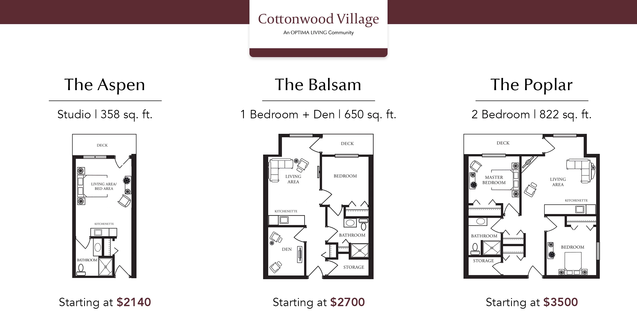 Cottonwood Village is an independent living home that focuses on the personalized care, comfort, and well-being of its residents. For the comfort of our residents, Cottonwood Village is a one-story building with no stairs. We offer studio, one-bedroom, and two-bedroom suite options. We offer three Cottonwood Village suite options.